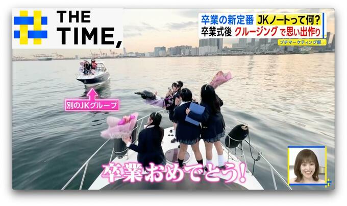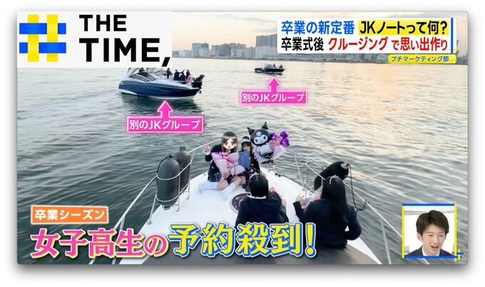 船室をバルーンなどでデコったら、「卒業おめでとう!!」とみんなで乾杯。動画も写真もしっかり撮って、デッキに出てみると東京湾をクルージングする別のJKグループも。