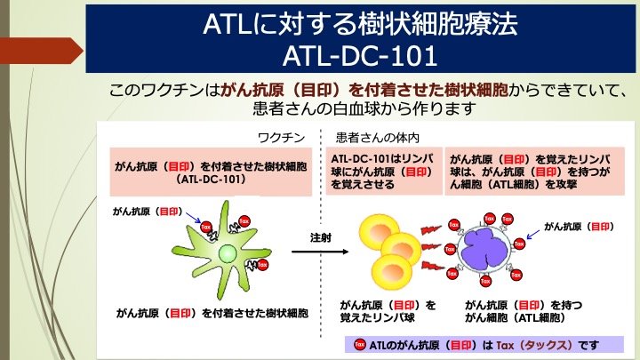 世界初の「Tax標的樹状細胞療法」。抗がん剤治療を経て「寛解」に至った患者自身の白血球からつくった「樹状細胞」を体内に戻して、「Tax」というがん抗原を認識できるリンパ球を教育し、がん細胞のみを攻撃させるものです。これにより再発を防ぐことにつながります。