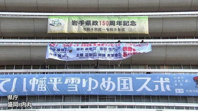 ミラノ・コルティナオリンピック™とパラリンピックに出場した、岩手県出身の6選手の健闘をたたえる横断幕が23日岩手県庁に掲げられました。