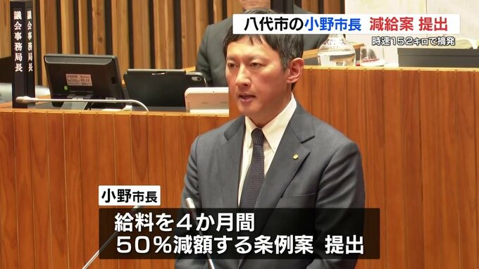 熊本県八代市の小野泰輔市長が、高速道路を時速152キロで走行し摘発された問題で、市長は、自らの給料をカットする条例案を議会に提出しました。