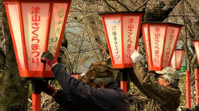 岡山県北の桜の名所、津山市の鶴山公園で、夜桜を楽しむためのぼんぼりが取り付けられました。岡山県で唯一日本さくら名所100選に選ばれている津山市の鶴山公園です。今月28日から開かれる津山さくらまつりに向け…