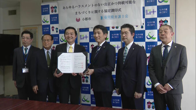 あらゆるハラスメントがないまちづくりを目指して福岡県小郡市と福岡県弁護士会が23日、協定を締結しました。小郡市役所では23日午前10時半から小郡市の加地良光市長と福岡県弁護士会の上田英友会長が協定に調印し…