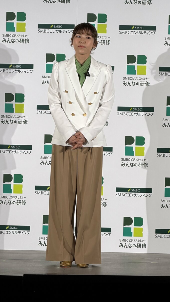 イベント中、ビジネスパーソンの7割が昇進や転勤など環境の変化をストレスと感じているというデータが発表されると、〝環境の変化ってとても緊張するので気持ちがすごく分かります〟と共感。本イベントで紹介された研修サービスについて、〝私自身も起業したり、何か始めるときに、こういうシステムが見つけられなかったので、すごくすてきなサービス〟と評価しました。