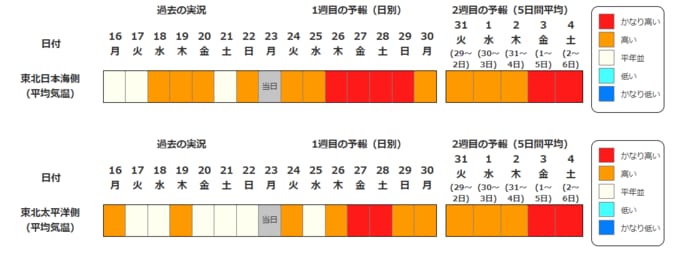 東北地方の向こう2週間の気温は、暖かい空気が流れ込みやすいため高く、かなり高い日もあるでしょう。