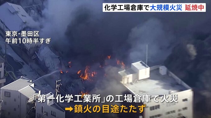 東京・墨田区の化学工場の倉庫で起きた大規模な火災は、出火から3時間以上たった今も延焼中です。午前10時ごろ、東京・墨田区にある「第一化学工業所」の工場の倉庫で起きた火災は、消防車など60台が出動し消火活…