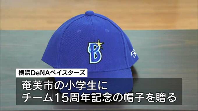 プロ野球横浜DeNAベイスターズ15周年を記念した帽子が23日、奄美市の小学生に贈られました。