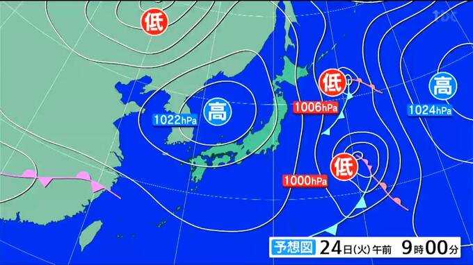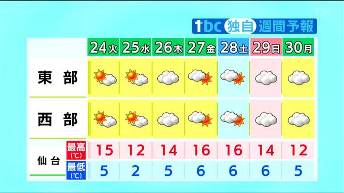 最低気温は、23日朝と同じくらいかやや高い所が多いですが、農作物に霜が降りるおそれがあります。最高気温は、14度から15度と、4月中旬並みでしょう。