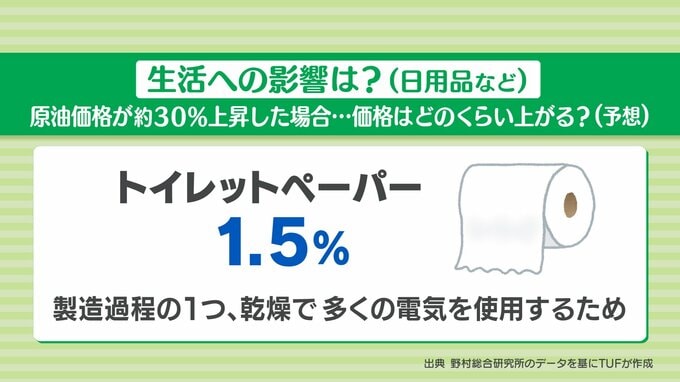 さらに、こんなものも値上がりすると予想されています。それが、トイレットペーパーです。製造過程で乾燥させる時に多くの電力を使うこともあり、およそ1.5%値上がりすると見られています。