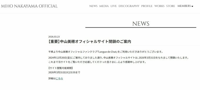 続けて「2024年12月20日(金)にご案内しておりました通り、中山美穂オフィシャルサイトは、2026年3月31日をもちまして閉鎖いたします。これまで当サイトをご覧いただき応援してくださった皆さまに、心より感謝申し上げます。」と、しています。