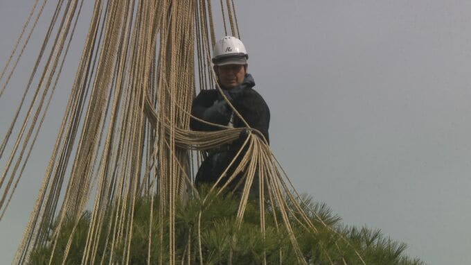 兼六園の霞ヶ池では、最後まで残っていた唐崎松と玩月松の雪吊りが取り外され、冬から春へと装いを新たにしていました。