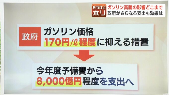 【ガソリン価格】急騰でタイヤ交換早まる?北海道ではガソリン携行缶が盗まれる被害相次ぐ…「平均燃費は気にします」3連休で観光客に聞いた本音 北海道放送 2026年3月23日(月) 20:00 国内 気になる今後の値動き 現在、政府はガソリン価格を1リットル170円程度に抑える措置を実施していて、新たに今年度の予備費から8000億円程度を基金に支出する方針を固めました。原油高騰の長期化に備えたもので、24日にも閣議決定する見通しです。