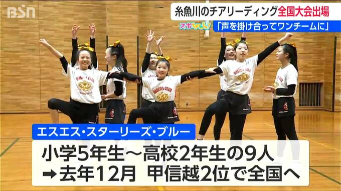小学5年生から高校2年生まで9人のメンバーが結集した、新潟県糸魚川市のチアリーディングチーム『エスエス・スターリーズ・ブルー(SS STARRYS BLUE)』が、28日に千葉の幕張メッセで行われる全国大会『全日本チアリーディング&ダンス選手権大会 USA Nationals 2026』に挑みます。