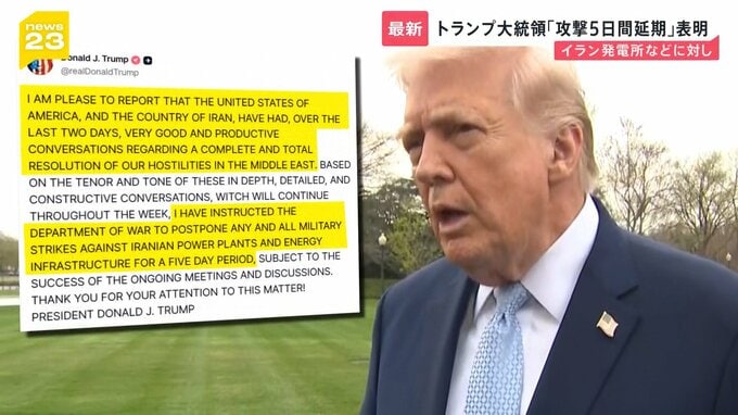 アメリカのトランプ大統領が23日日本時間の午後8時すぎ、SNSでイランの発電所などへの攻撃を「5日間延期する」と表明しました。トランプ氏はこの2日間、イランと「非常に良い、生産的な協議を行ってきた」とも明か…