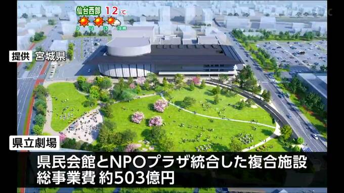 県立劇場は、県民会館とNPOプラザを統合した複合施設で、総事業費は約503億円。地下1階・地上4階建てで、最新の音響設備を備えた大ホールなどが整備されます。