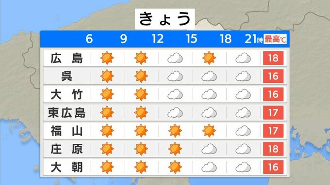 最低気温は、きのうより3~6℃ほど低く、広島市中区7.5℃・福山市4.2℃・庄原市-0.4℃で、ヒンヤリとした朝でした。このあと昼前まで日ざしがよく届き、グッと気温が上がる見込みです。一日の寒暖差が大きくなります。