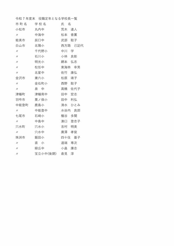 教職員人事異動2026石川県 「あの先生はどこに?」全名簿掲載・令和8年度「小学校・中学校・高校・特別支援学校 北陸放送 2026年3月24日(火) 18:32 国内 【役職定年となる学校長(小中学校)】