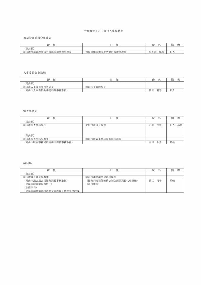 岡山市職員人事異動速報(2026年4月1日付)「“わくわくする”桃太郎のまち岡山」の実現に向け【名簿一覧掲載・検索】 RSK山陽放送 2026年3月24日(火) 11:41 国内 続き 名簿などを画像一覧でみる
