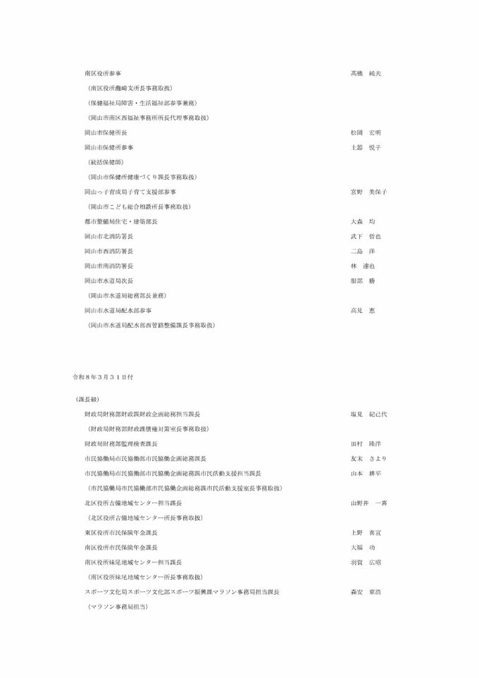 岡山市職員人事異動速報(2026年4月1日付)「“わくわくする”桃太郎のまち岡山」の実現に向け【名簿一覧掲載・検索】 RSK山陽放送 2026年3月24日(火) 11:41 国内 続き 名簿などを画像一覧でみる