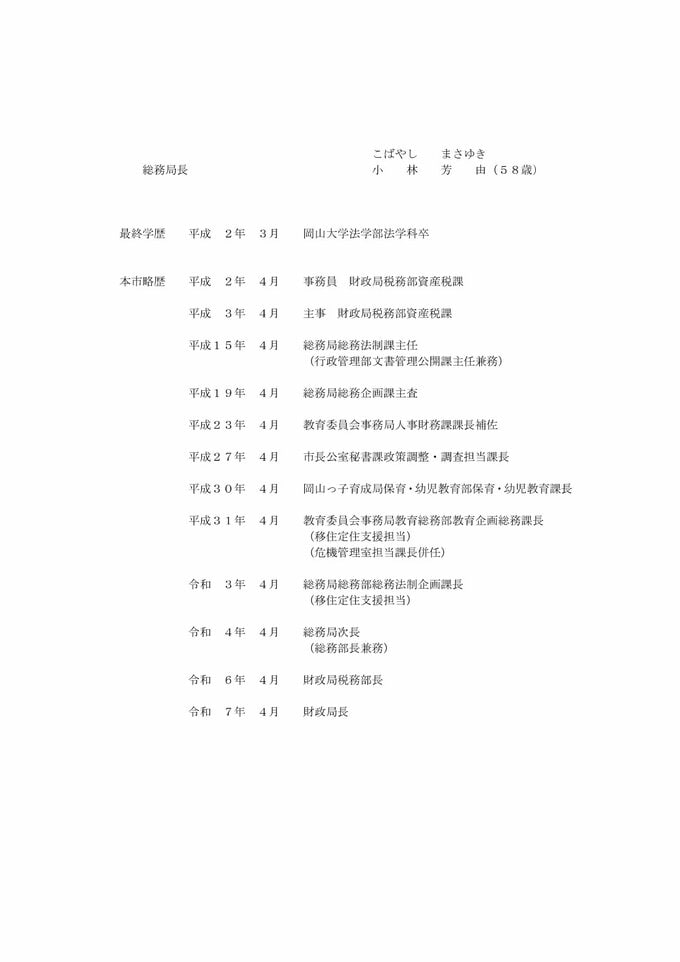 岡山市職員人事異動速報(2026年4月1日付)「“わくわくする”桃太郎のまち岡山」の実現に向け【名簿一覧掲載・検索】 RSK山陽放送 2026年3月24日(火) 11:41 国内 経歴 小林 芳由 氏 名簿などを画像一覧でみる