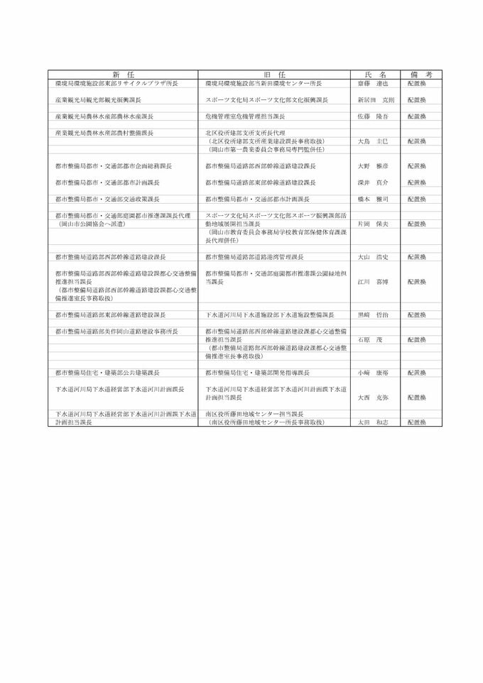 岡山市職員人事異動速報(2026年4月1日付)「“わくわくする”桃太郎のまち岡山」の実現に向け【名簿一覧掲載・検索】 RSK山陽放送 2026年3月24日(火) 11:41 国内 続き 名簿などを画像一覧でみる