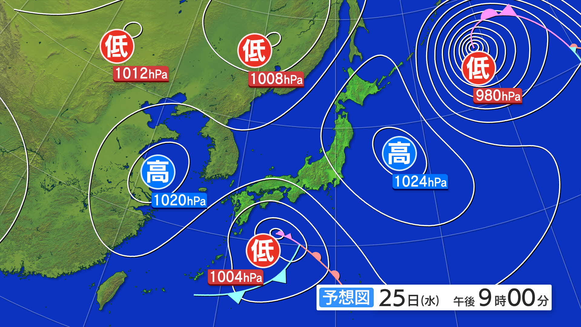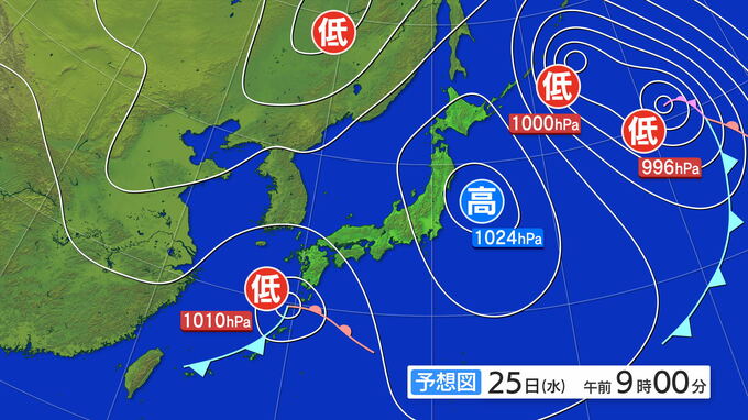 25日(水)午前9時の予想天気図です。低気圧が九州の奄美諸島付近にあり、前線をともなっています。