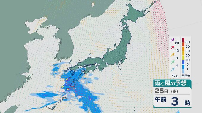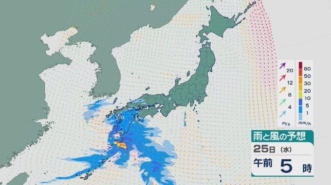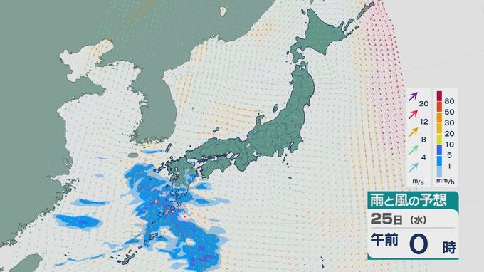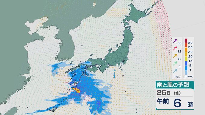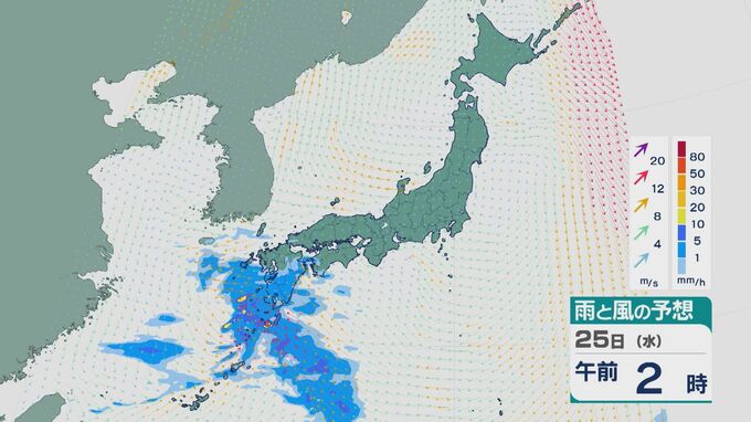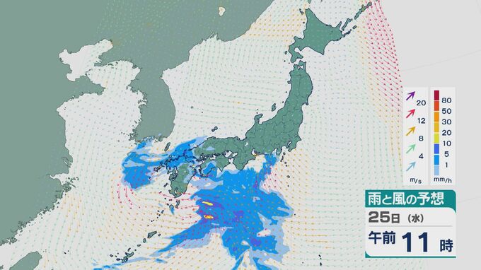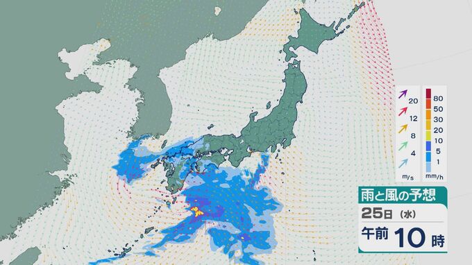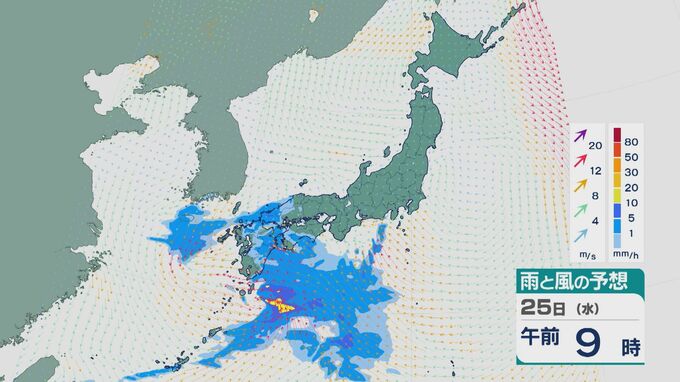 25日は雨雲は次第に東に広がる見込みです。午前中は九州や中国・四国で雨が降り沿岸部などで振り方が強まるところがありそうです。