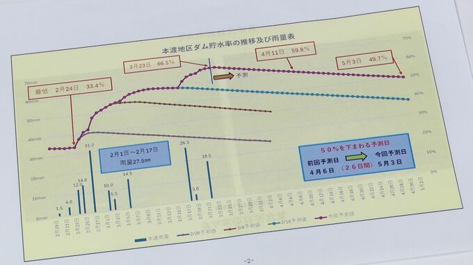 さらに今後もまとまった雨が見込まれ、貯水率が50%を下回る予測日も5月3日になったことから、天草市は「3月23日をもって渇水対策本部会議を閉じる」と発表しました。