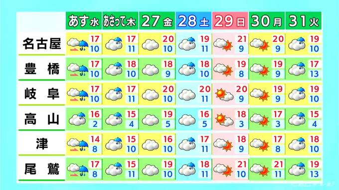 あす水曜日の午後は、沿岸部から次第に雨雲が広がるでしょう。その後も、土曜日にかけてすっきりしない天気が続く見込みです。日曜日は、晴れて気温が高くなるでしょう。