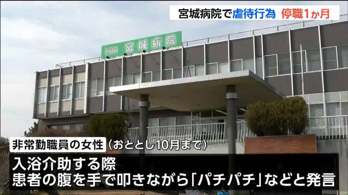 24日から停職1か月の懲戒処分となったのは、宮城病院の看護部に所属する60代の非常勤職員の女性です。病院によりますと非常勤職員の女性は、2024年10月までの長期間にわたり入院患者8人に対して、名前を呼び捨てで呼んだり、入浴介助をする際、患者の腹を手で叩きながら「パチパチ」などと発言したりしたということです。