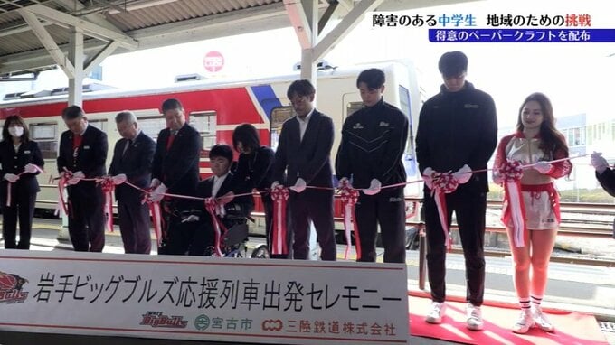 10日、三陸鉄道宮古駅で行われたプロバスケットボールチーム・岩手ビッグブルズの応援列車出発式。ここに、一人の中学生が招待されました。