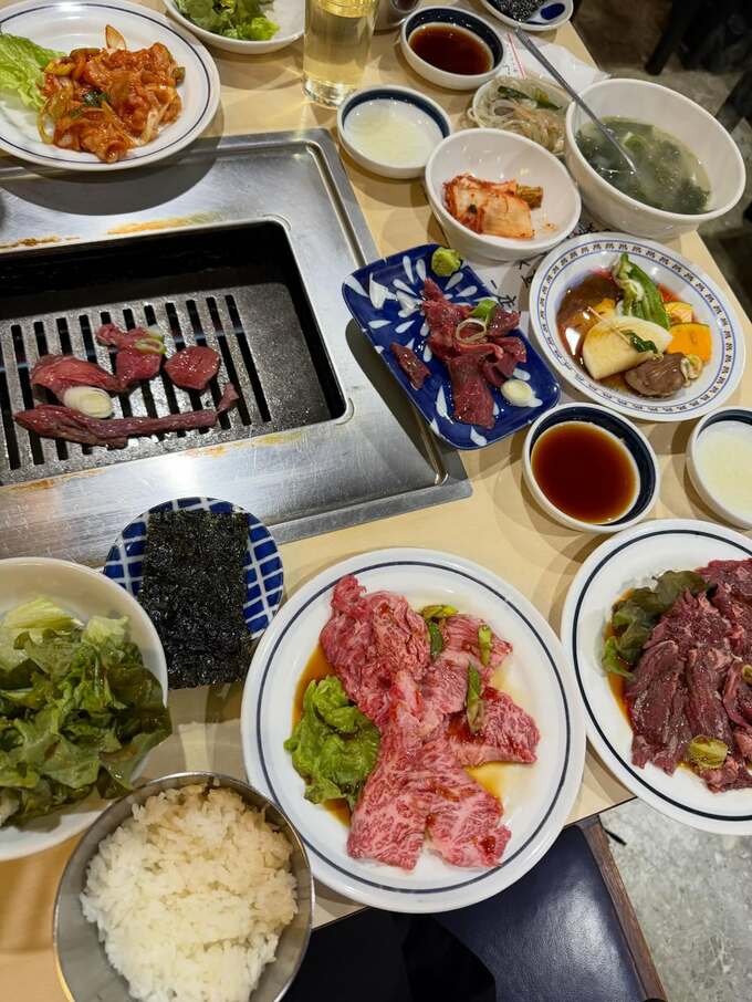 テーブルには鉄板グリルが置かれ、赤身や霜降りの牛肉のほか、キムチ・野菜・白米など多彩な品が並び、ボリューム感あふれるランチの様子が伝わってきます。