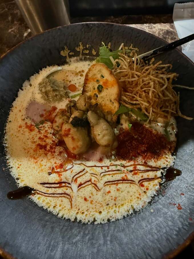 ラーメンは黒い丼に白濁したスープが注がれ、赤い油と粉末、牡蠣、緑の葉物が彩りを添えた、見た目にも華やかな一杯です。