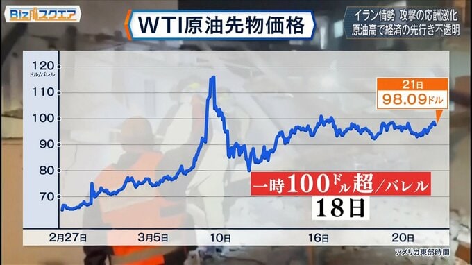 イラン情勢の緊迫化を受けアメリカのWTI原油先物価格は18日、一時1バレル=100ドルを突破。
