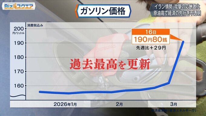 また、18日に発表されたレギュラーガソリンの全国の平均小売価格(消費税込み)は「1リットル=190円80銭」と、前の週と比べ29円値上がりし“過去最高を更新”した。