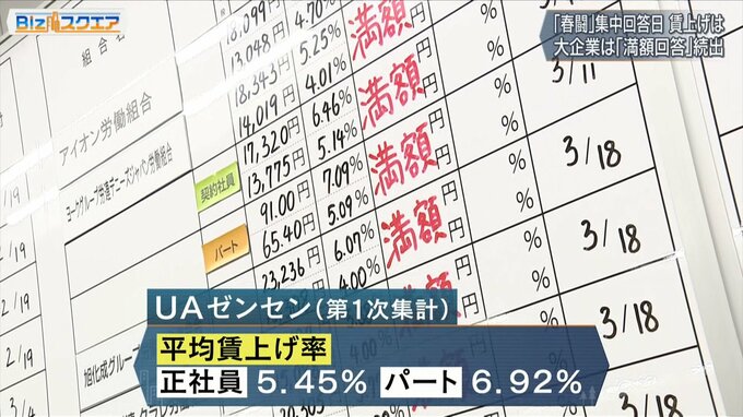 流通・外食・繊維など2100を超える労働組合が加盟し、組合員の約6割をパートが占める国内最大級の労働団体『UAゼンセン』の第1次集計では、平均賃上げ率は▼正社員:5.45%▼パート:6.92%で、パートは同じ時期として過去最高を更新している。(19日発表)