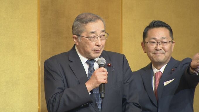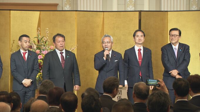 また、2月の衆院選で当選した国会議員17人が壇上に並び挨拶しました。