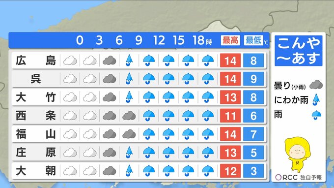 【あす3/25(水)広島天気 】朝から傘の出番 日中は本降りの雨 昼間も北風ひんやり寒い 中国放送 2026年3月24日(火) 19:05 国内 天気 日中の気温大幅ダウン 北風で寒い あすは朝から気温変化が小さい一日になるでしょう。日中の気温は、きょうより5℃以上低くなる見込みで、北風が吹いて空気がひんやり感じられるでしょう。日中も上着が必要になりそうです。暖かくしてお過ごしください。