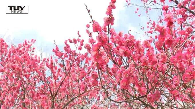 こちら山形市の霞城公園です。梅の花びらがそよ風になびき、見ごろを迎えていました。