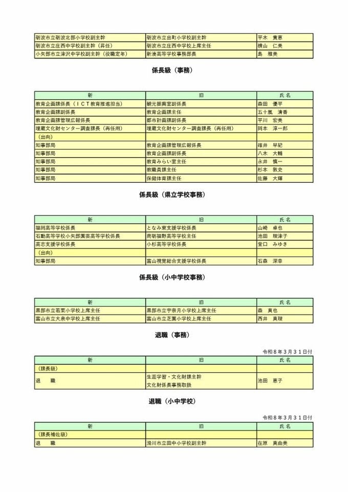 【富山県職員】人事異動 2026年(令和8年)4月 【異動一覧リスト】女性管理職106人、管理職の22.7%占める チューリップテレビ 2026年3月24日(火) 17:35 国内 暮らし・マネー 教育委員会 富山県職員2026