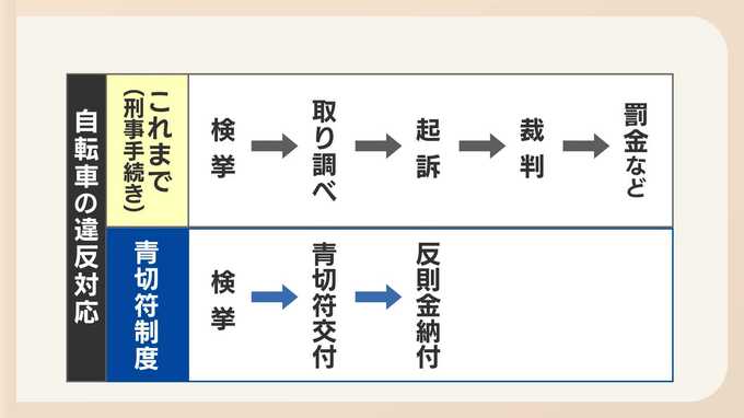 これまで自転車の違反は、刑事手続きで処理されていましたが、今後は自動車の違反と同様、反則金を納めることで手続きが完了する仕組みに変わります。
