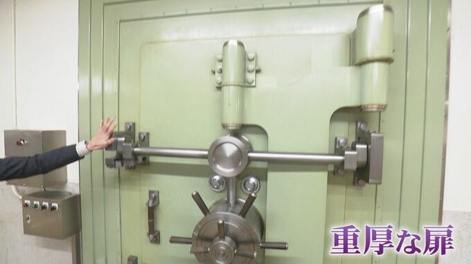 牛田和希キャスター「初めて旧日銀金沢支店の内部にやって来ました。小学校の体育館ぐらい広い空間が広がっていますね。重厚な扉、相当頑丈ですよ。この向こうにはどんな空間が広がっているんでしょうか」