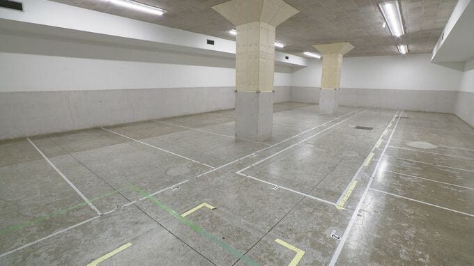 金庫室は3室あり、合わせておよそ600平方メートル。この空間が金沢21世紀美術館の仮の展示室となりますが、建築基準法上必要とされる避難経路がないため、緑色の線までしか入れないということです。