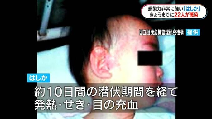 「はしか」に感染するとおよそ10日間の潜伏期間のあと、発熱やせき、目の充血といった風邪のような症状があらわれます。