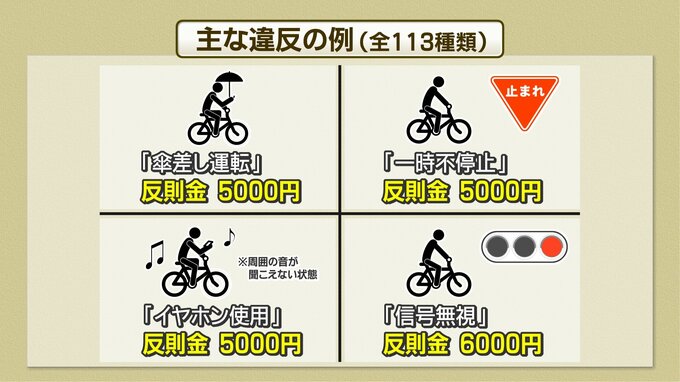 青切符の対象となる反則行為はこのほか、夜間の無灯火など113種類にのぼります。各項目は警視庁がウェブサイトで公表している「自転車ルールブック」で確認できます。(取材 比嘉大智)