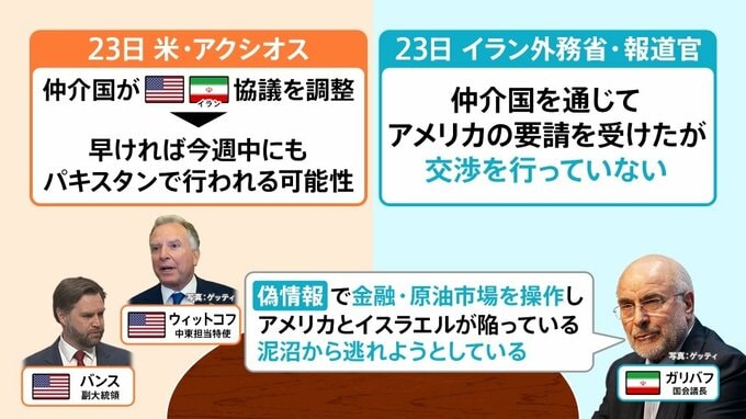 アメリカのニュースサイト・アクシオスは23日、「仲介国があり、アメリカとイランの協議を調整している。早ければ今週中にもパキスタンで行われる可能性がある」と説明していました。