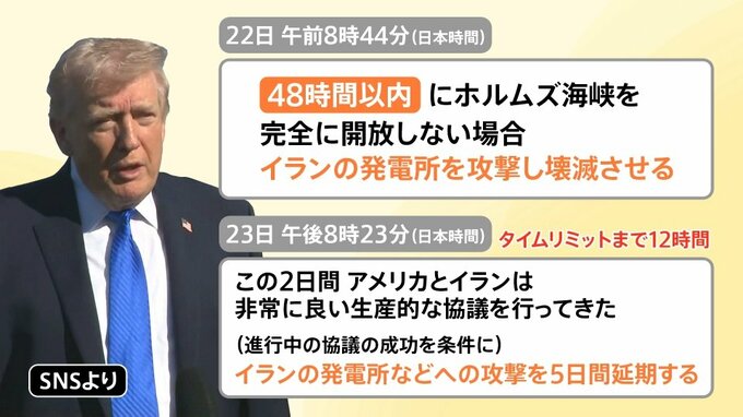 もともとトランプ大統領は、3月22日の午前8時44分(日本時間)時点では、SNSに「48時間以内にホルムズ海峡を完全に開放しない場合、イランの発電所を攻撃し壊滅させる」と投稿していました。