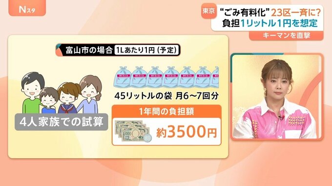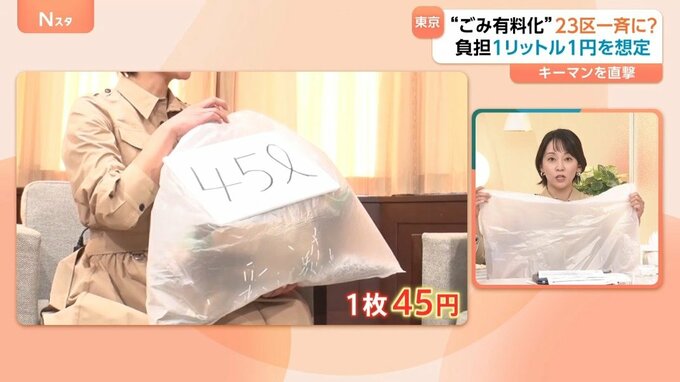 吉住会長によると、現在想定されているのはごみ袋1リットルあたり1円。つまり、45リットルのごみ袋1枚で45円ということになります。