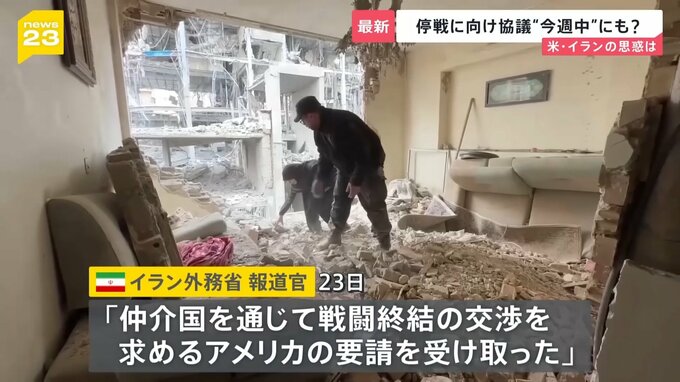 イラン外務省の報道官は23日、国営メディアに「アメリカとは交渉を行っていない」としつつも、「仲介国を通じて戦闘終結の交渉を求めるアメリカの要請を受け取った」と明らかにしました。