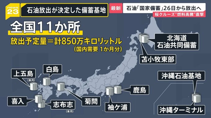 全国11か所の備蓄基地から順次、放出していく計画で、予定量は国内需要の1か月分=あわせて850万キロリットル。