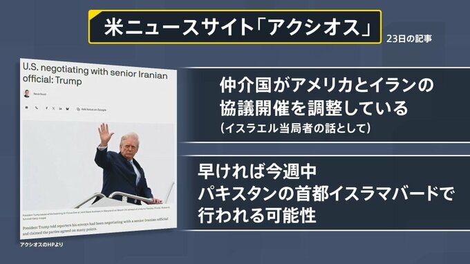 アメリカのニュースサイト「アクシオス」は23日、イスラエル当局者の話として、仲介国がアメリカとイランの協議の開催を調整しているとし、早ければ今週中にパキスタンの首都イスラマバードで行われる可能性があると報じています。
